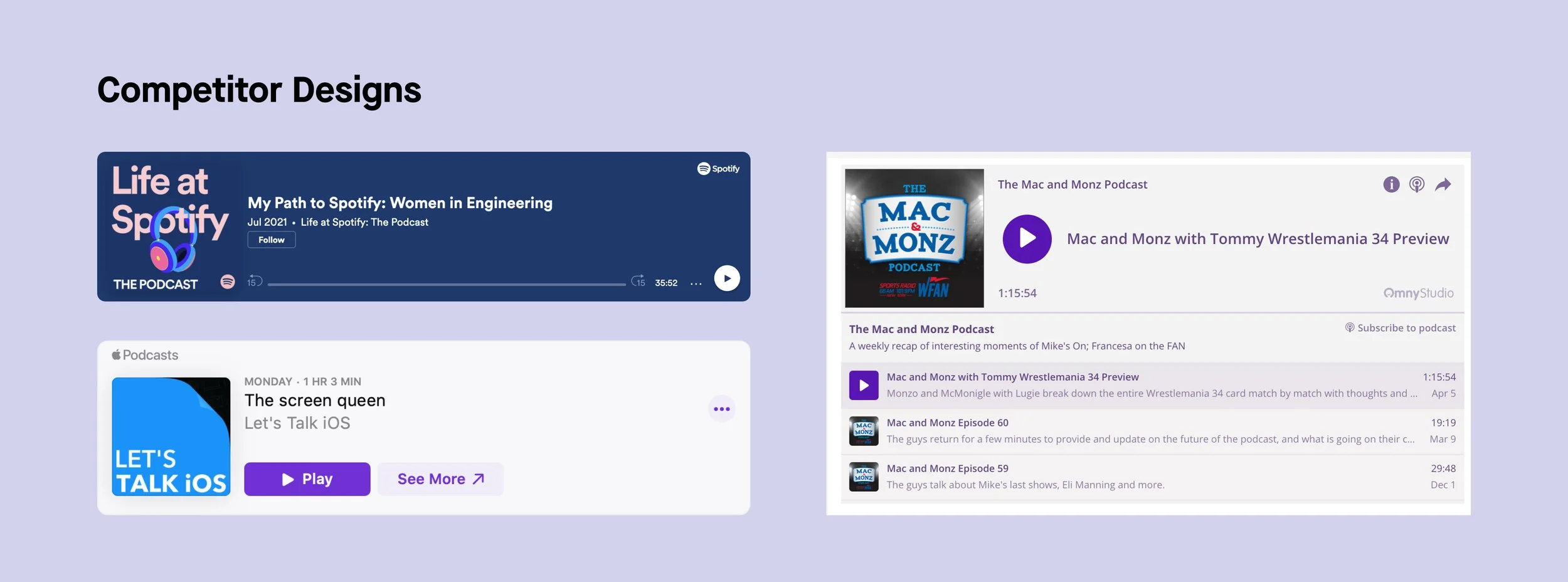 I began by examining embed players from leading audio platforms including Spotify, Apple, and Omny to identify industry best practices and potential opportunities for differentiation. This research provided valuable context for approaching our specific challenges.