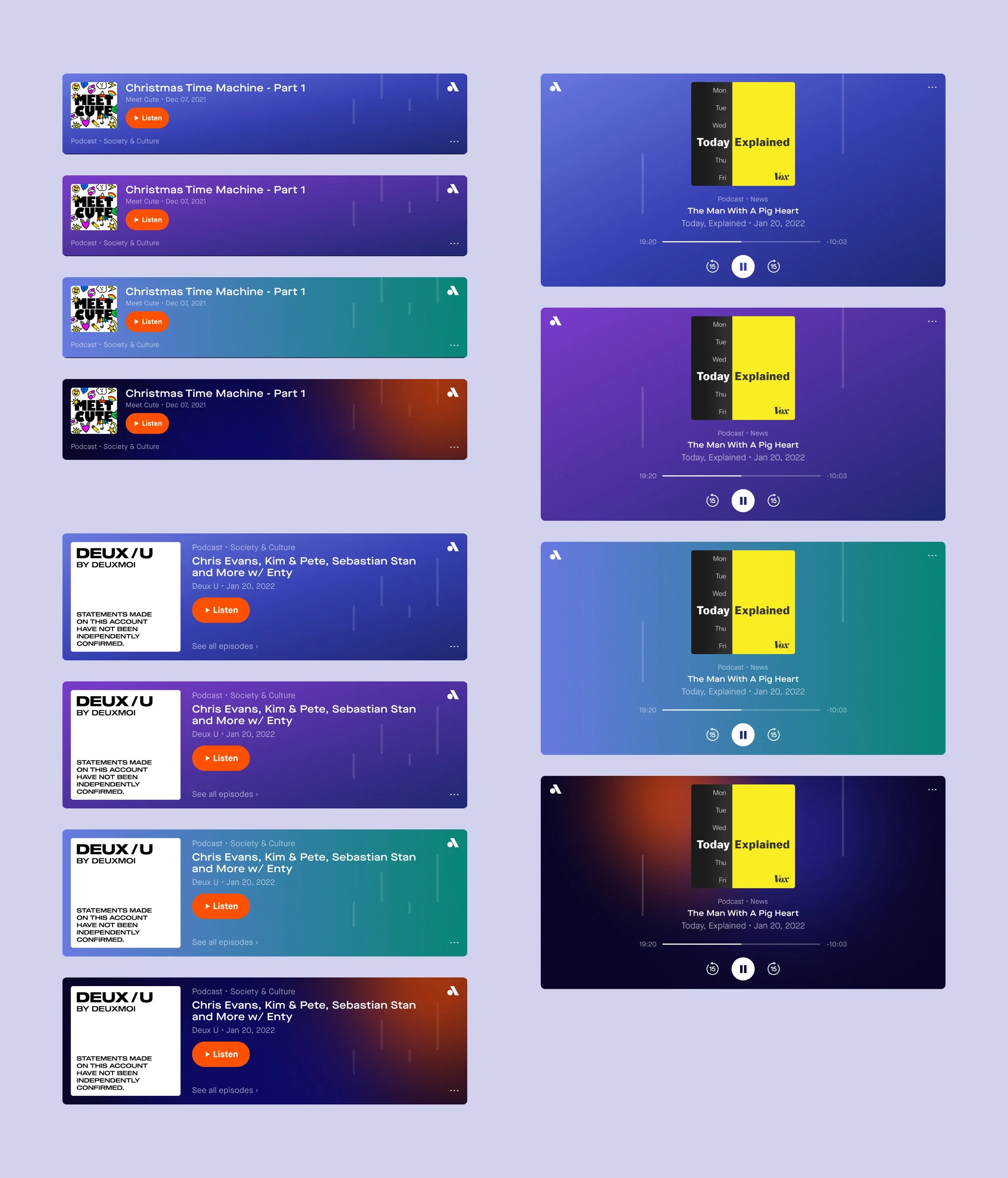 Based on testing results of the different size and color variations, the medium-sized purple version performed best across user tests. Once we came to this conclusion, I then extended this design system across all breakpoints and content types, ensuring consistency while accommodating the requirements of each audio format.