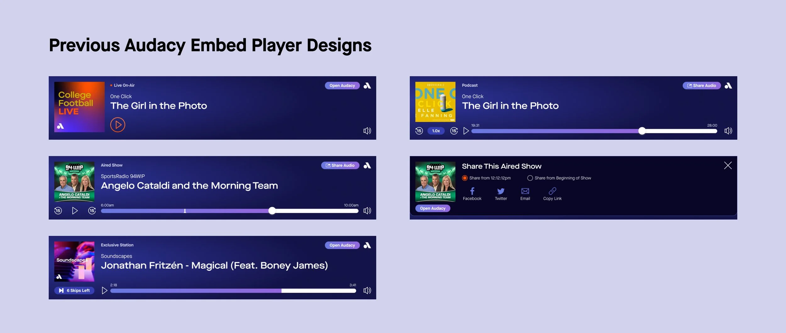 I also assessed the previous iteration of the embed player designs, taking note of areas of improvement. A big goal of this redesign was to better align visually with Audacy's recent redesign of it’s site and app.